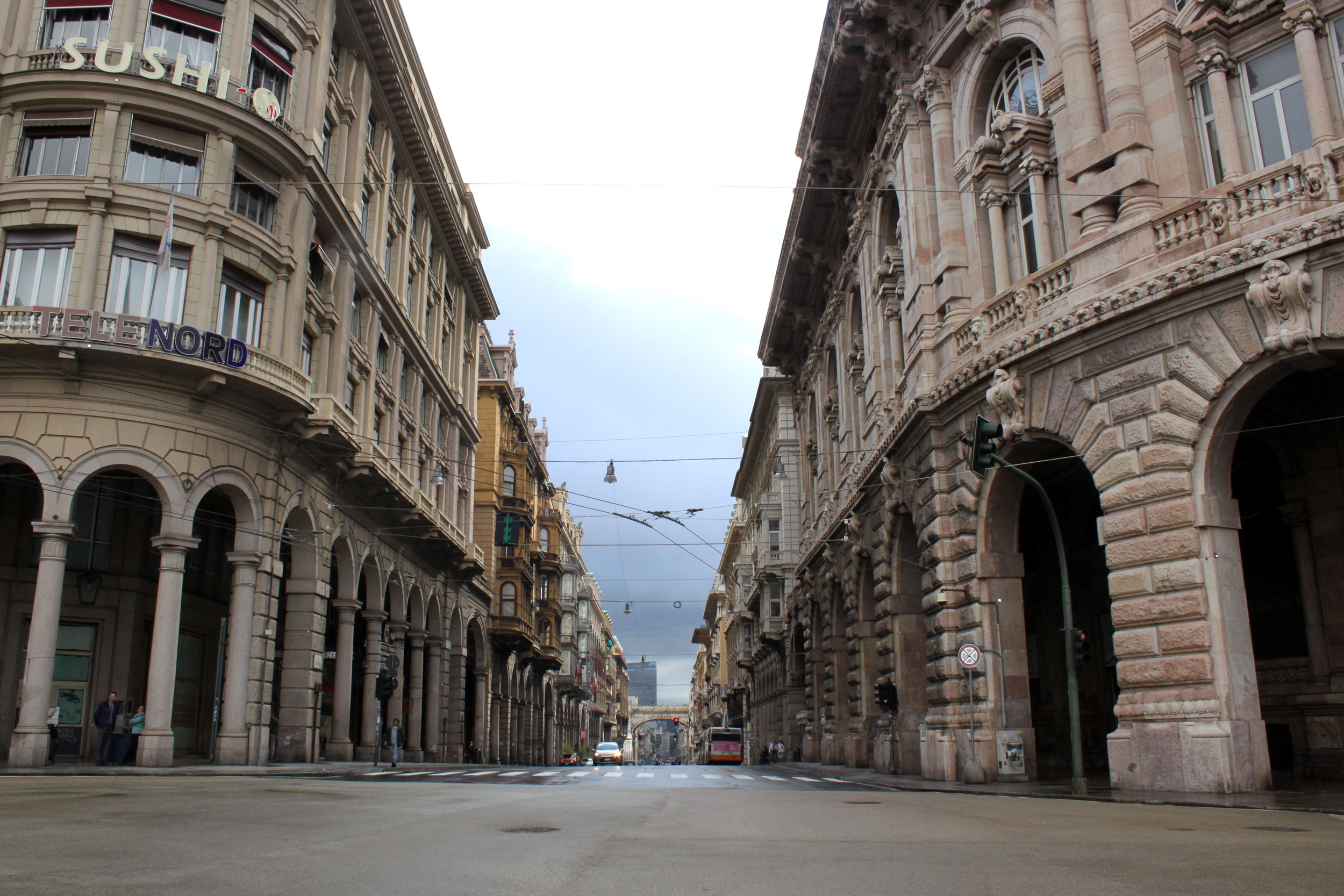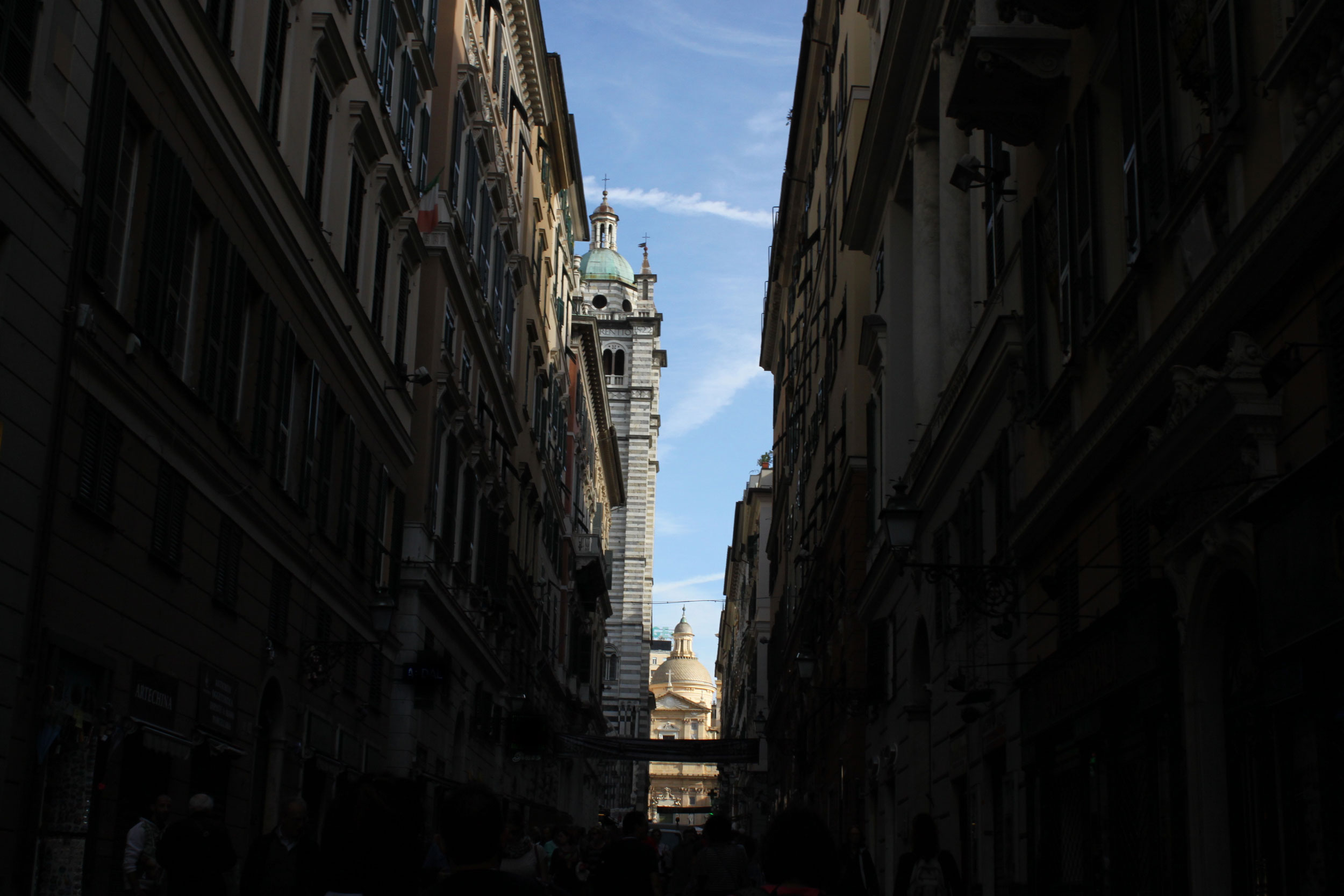 Étonnante ville aux façades colorées, aux architectures diverses, je n’avais pas entendu grand chose de positif sur elle, mis à part son pesto, mais finalement elle a du charme cette géante. Elle vient comme un colosse imposer son univers puis finalement montre vraiment ses subtilités, que ce soit au coin d’une ruelle dans un petit restaurant, au pied de l’église avec un lion au regard terrifié. Tout est toujours construit dans une verticalité. On s’y sent petit à un moment et puissant dans la ruelle suivante.
