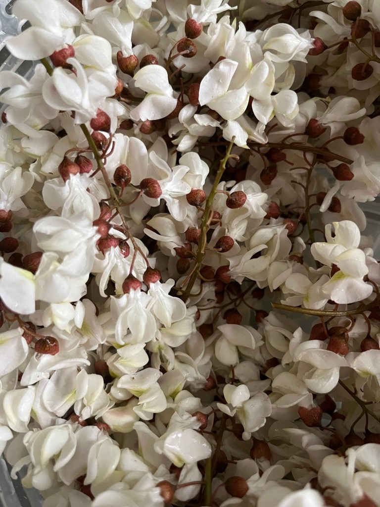 - 20 grappes de fleurs d’acacia : choisissez-les fraîches et bien ouvertes pour un meilleur goût.